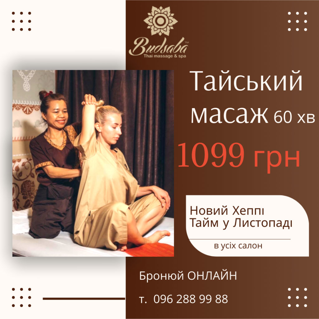 Вартість тайського масажу 60 хв по Акції «Хєппі Тайм» знижена.
