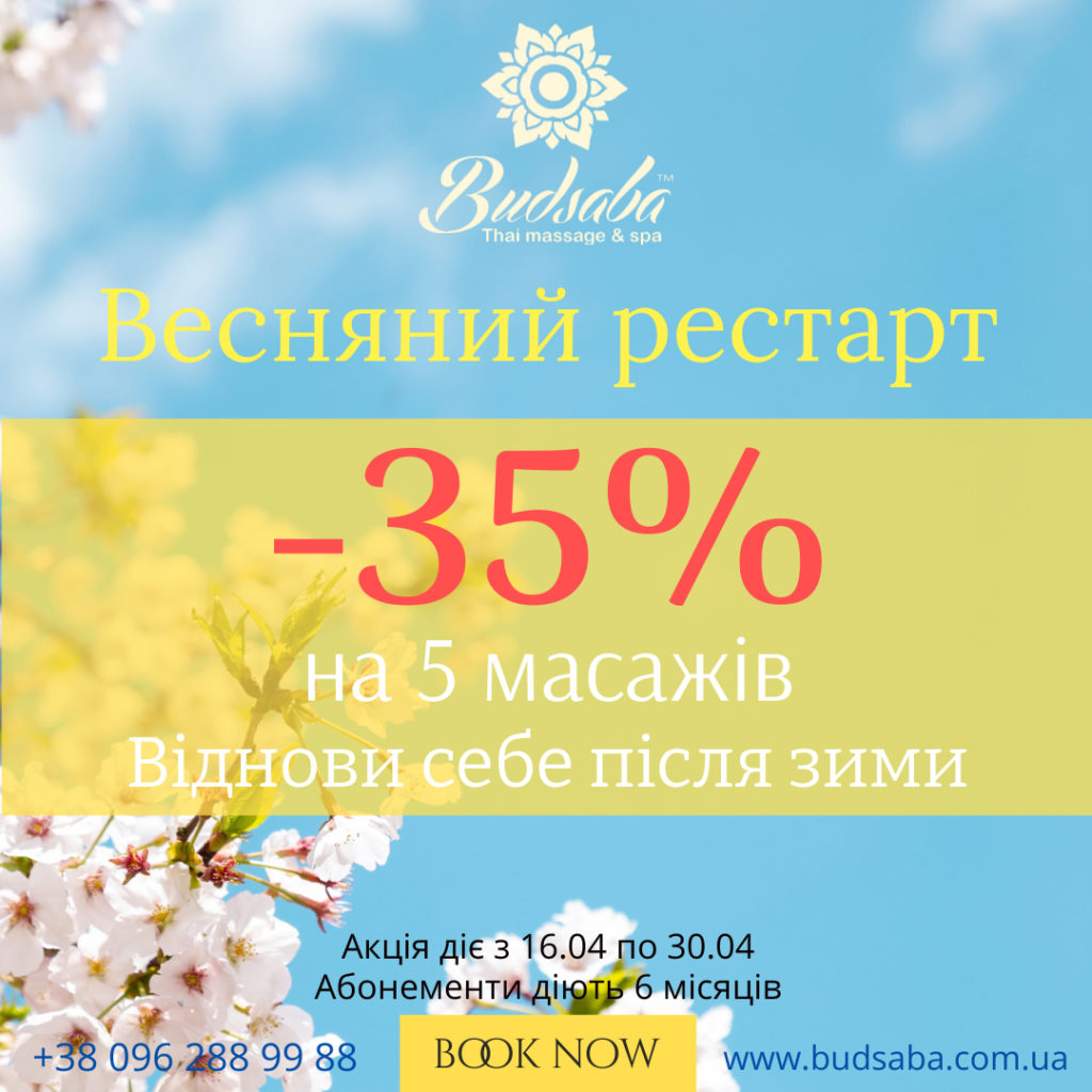 Акція діє масаж від тайських майстрів у всіх салонах в будні дні з 10.00 до 14.30 у Києві і з 10.00 до 16.00 у Львові, впродовж квітня.
